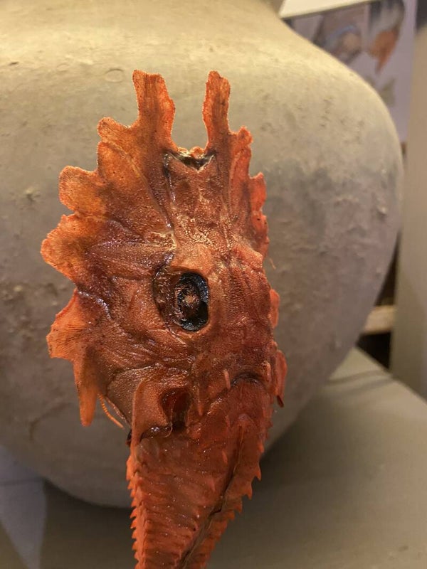 Gargariscus prionocephalus op statief, ook gekend als rode poon