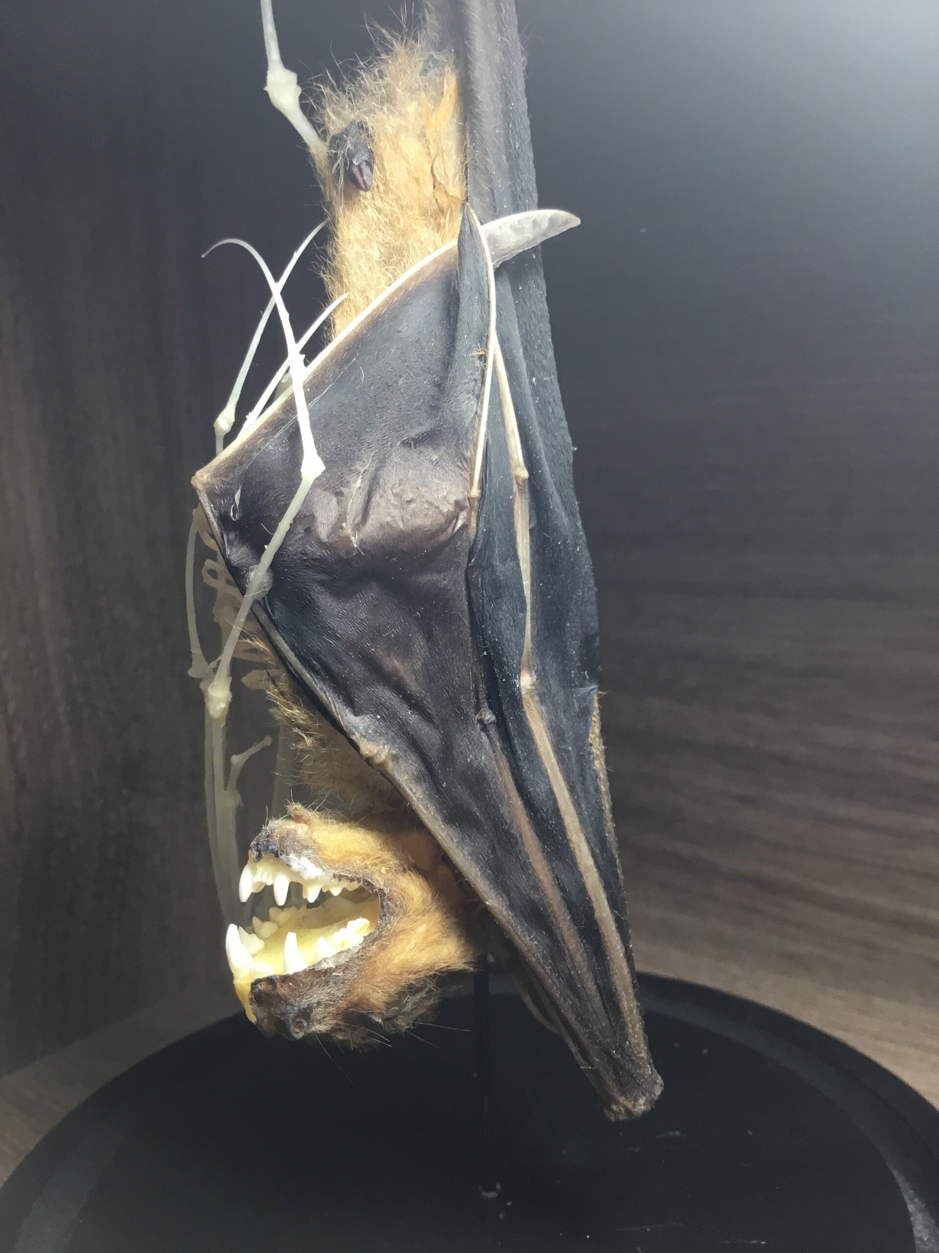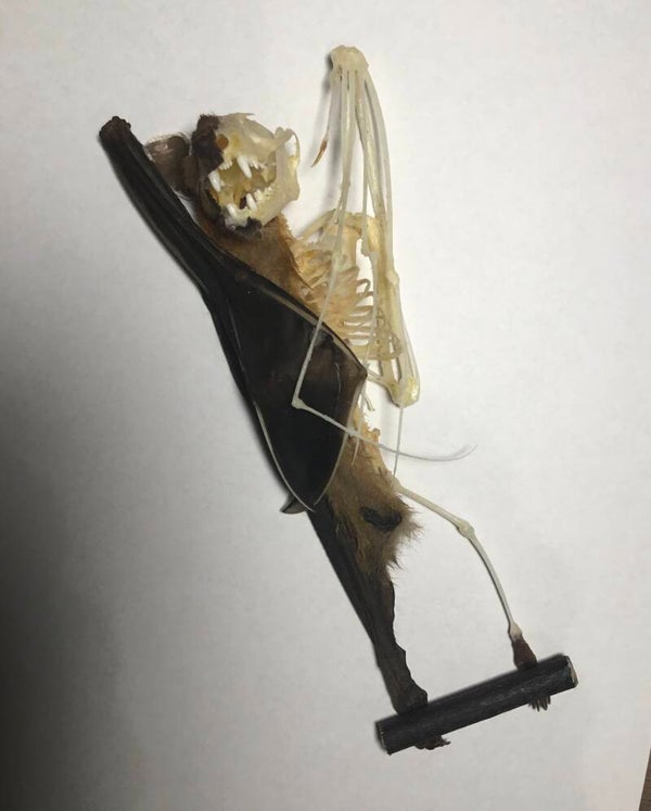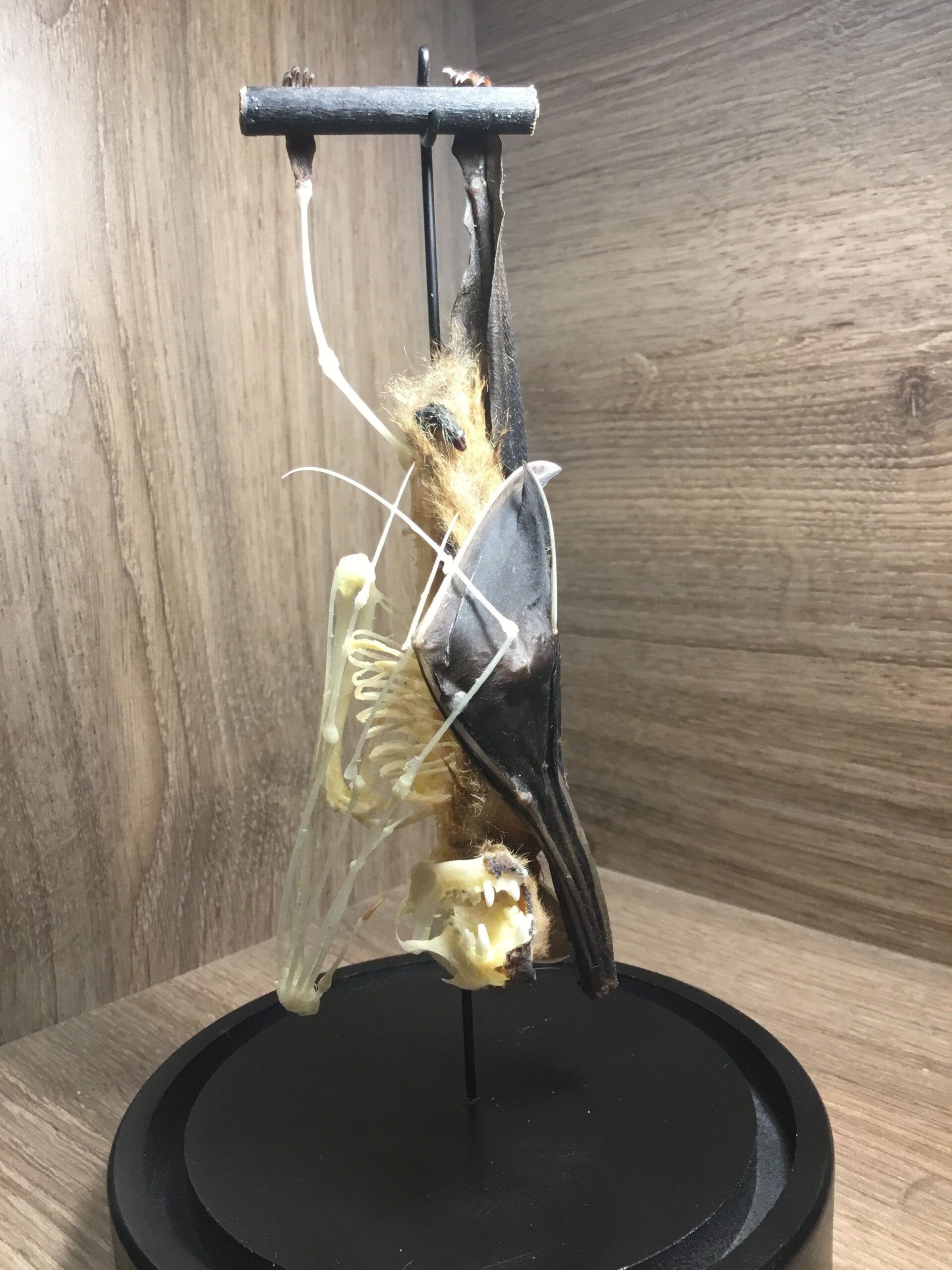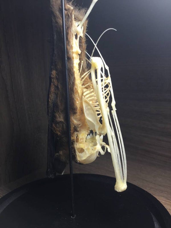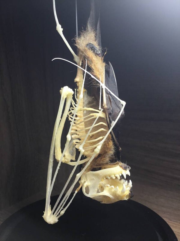 Hangende vleerhond "Cynopterus brachyotis" half skelet in stolp